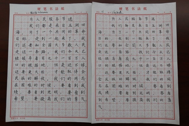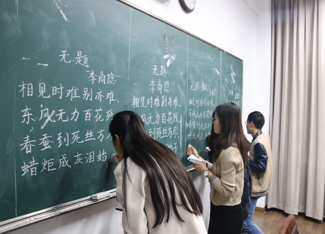 书法作为中华优秀传统文化的重要组成部分,一笔一划都凸显着民族风格和民族气派。本次比赛采用正楷字体书写,横划写出了担当,竖划写出了正直,撇捺写出了性格,硬笔所书写的内容《为人民服务》更写出了“初心使命”,每一份作品都流露着马院学子的情怀。同样在粉笔字比赛过程中,参赛的20名同学们高度认真和投入,倾注情感书写李商隐《无题》一诗,情感是整个书法作品气韵的彰显,整洁的板面,方正的字体以及流畅的书写均给人一种美的享受。